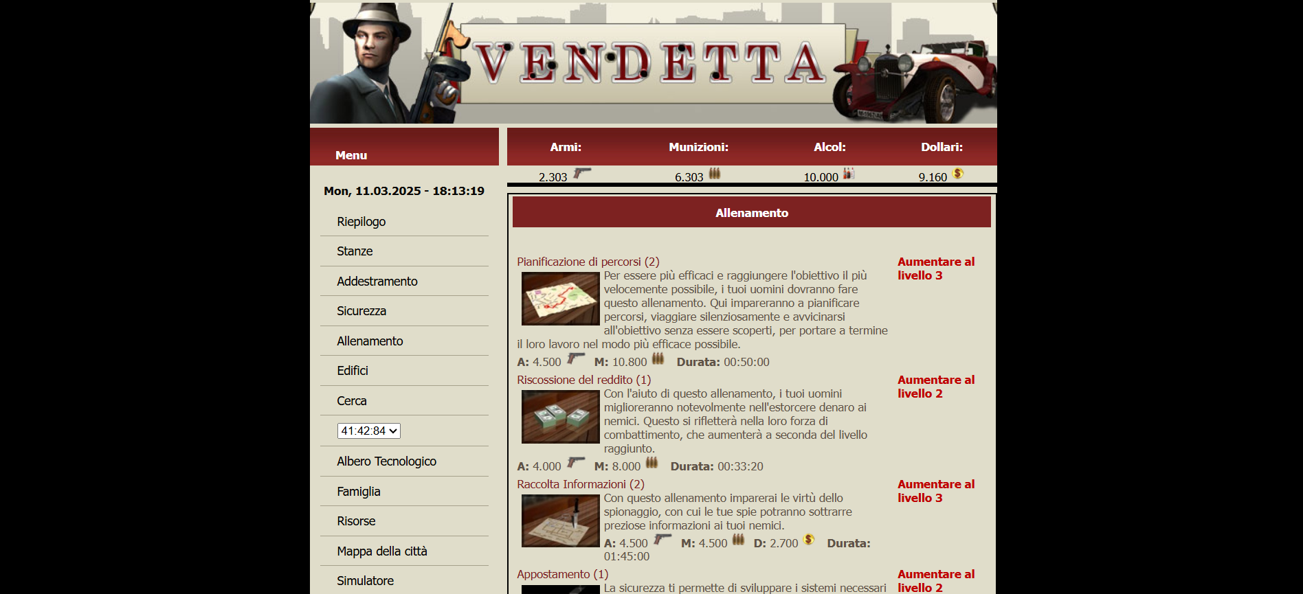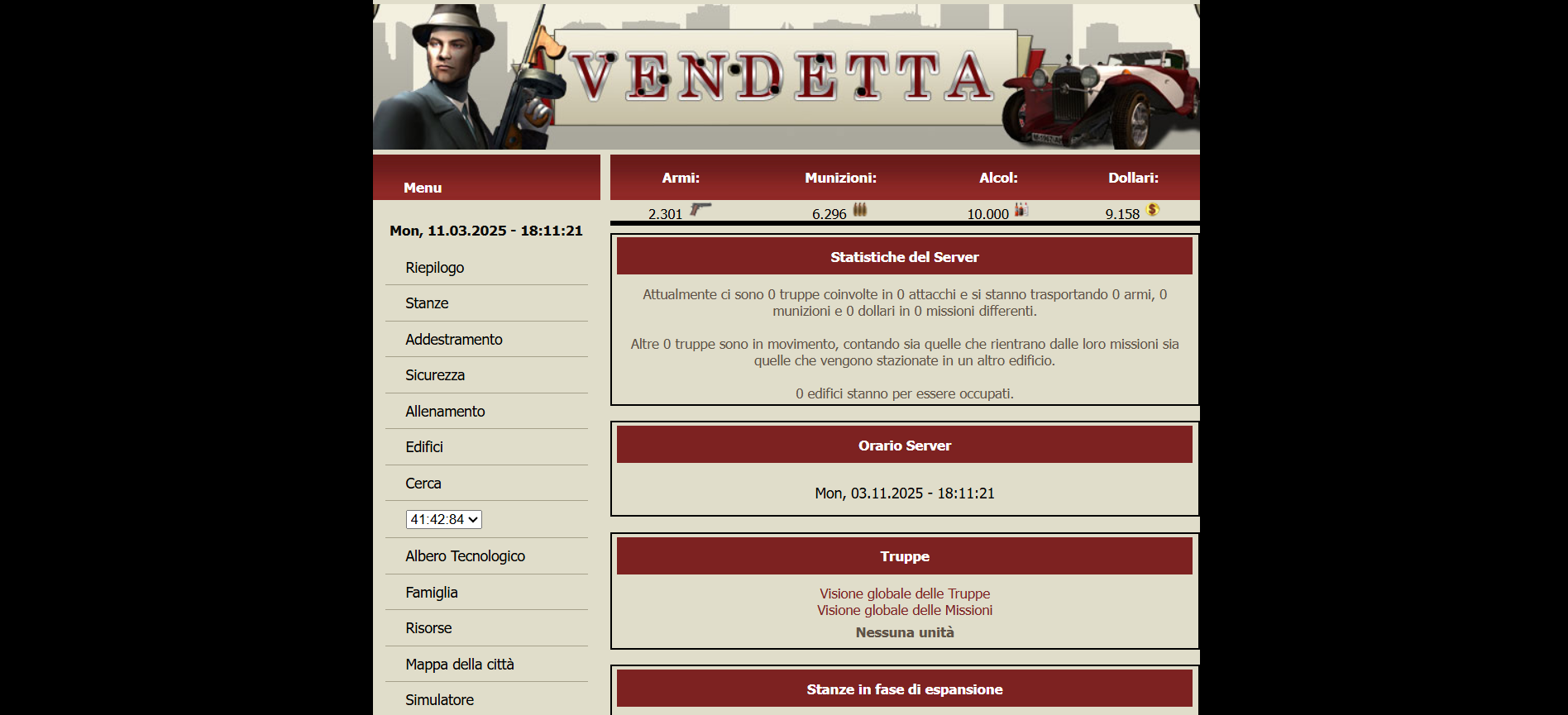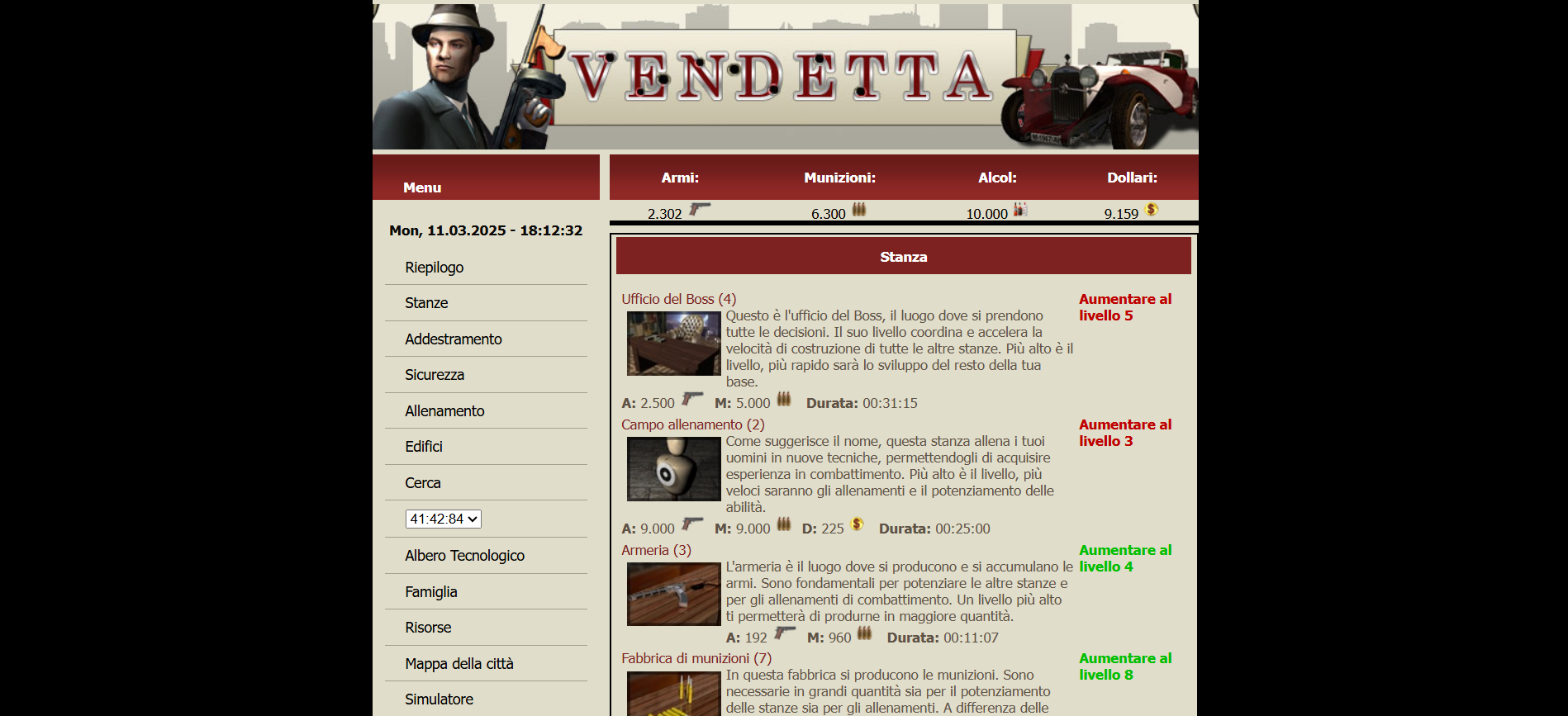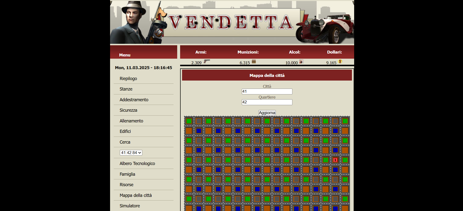 Vendetta è un gioco strategico con migliaia di altri giocatori che competono tra di loro contemporaneamente. Tutto quello di cui avete bisogno per giocare e´ un comune web browser.